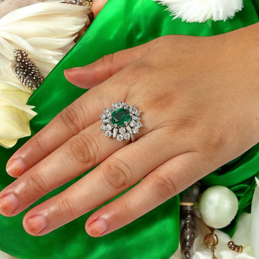 Single Green Stone Surrounded With White Swarovski Cocktail Ring