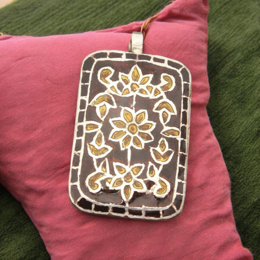 Silver Rectangle Design Enamel Pendant with Chain