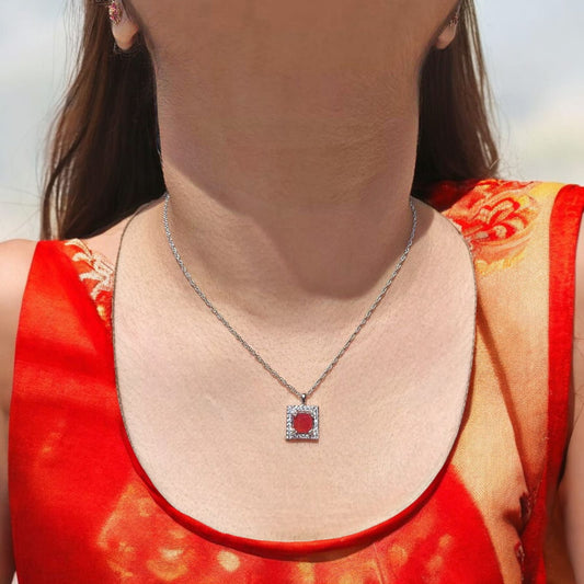 Ruby Color Stone & 7mm White Stone Pendant with Chain
