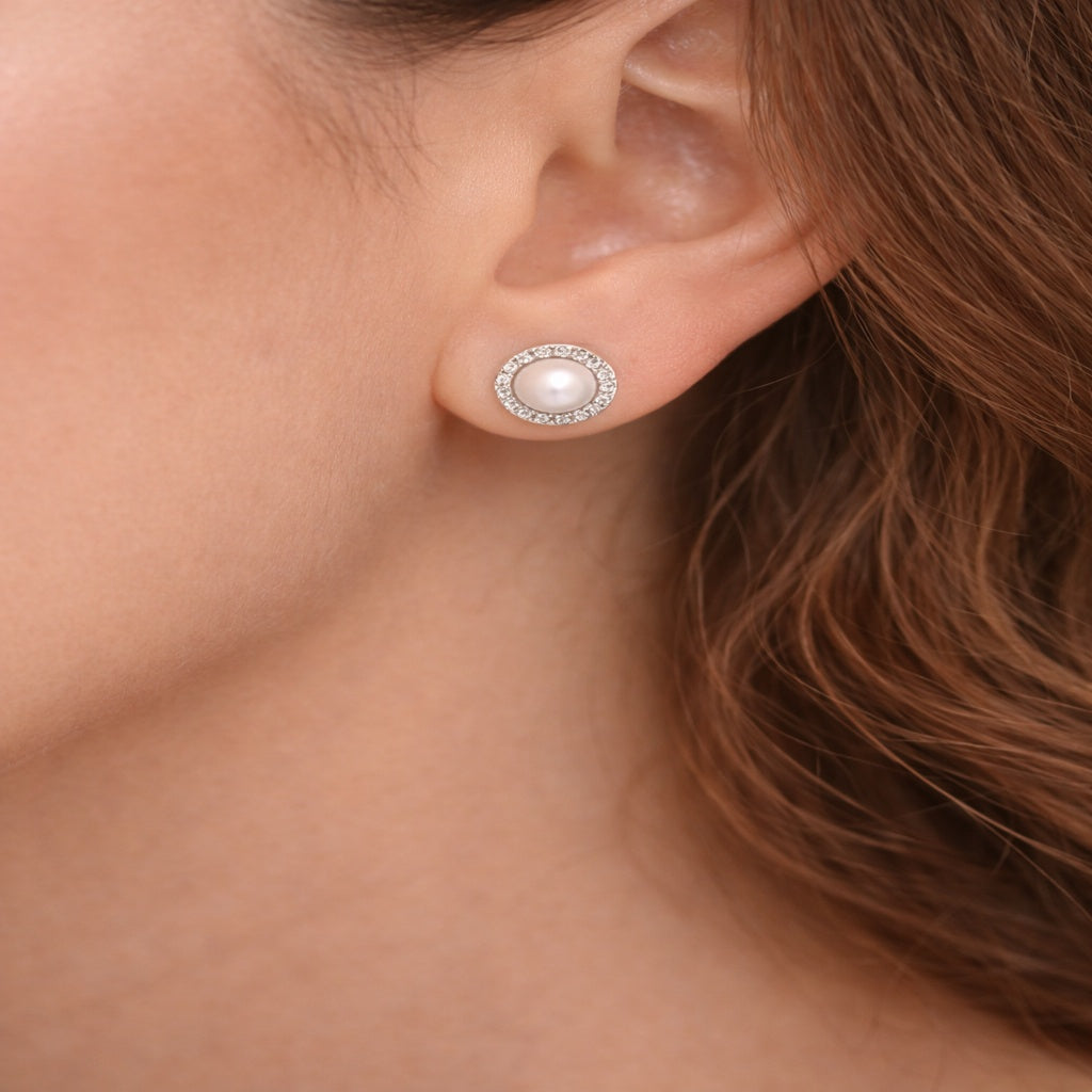 These sterling silver pearl stud earrings are crafted from authentic 925 silver and designed for everyday elegance. The center pearl is surrounded by finely set cubic zirconia stones that add soft sparkle while keeping the overall look minimal and refined.