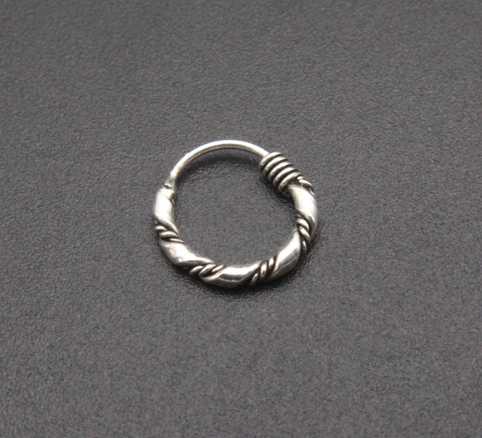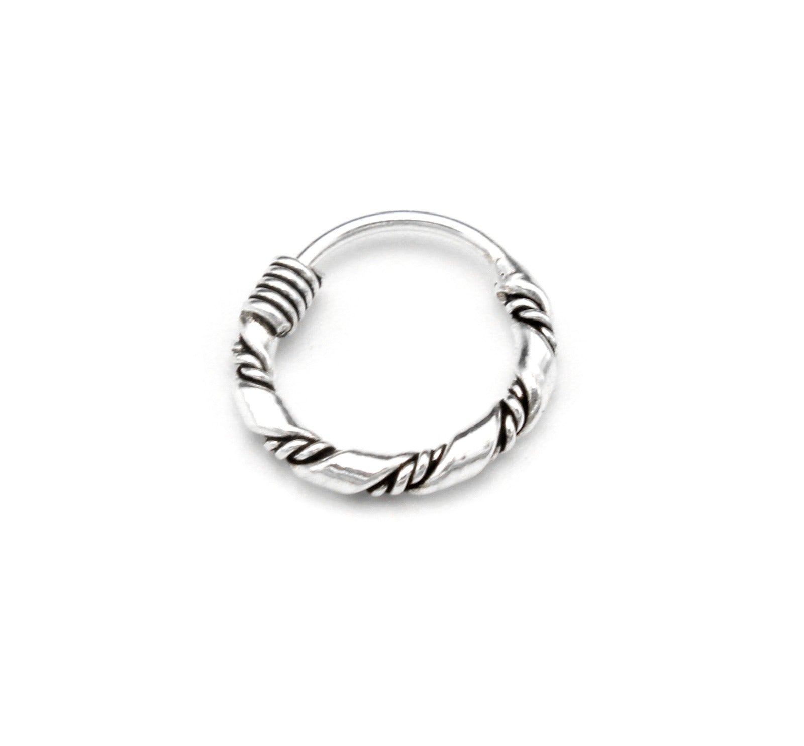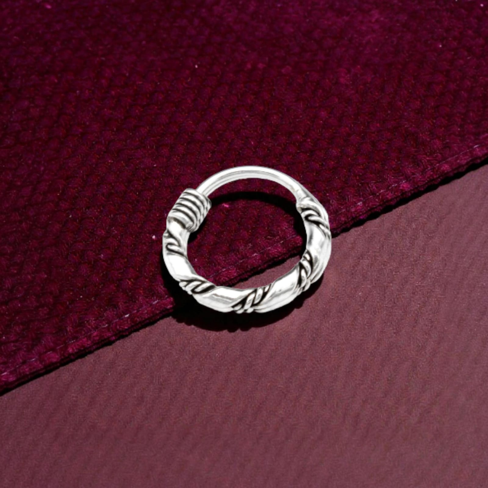 This sterling silver nose ring is made from authentic 925 silver and designed for daily comfort. The twisted rope pattern with subtle oxidised detailing gives it a classic handcrafted look while maintaining a clean silver finish.